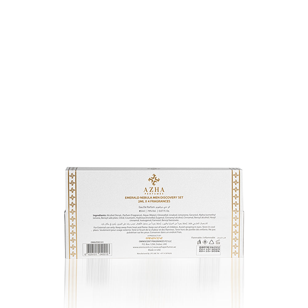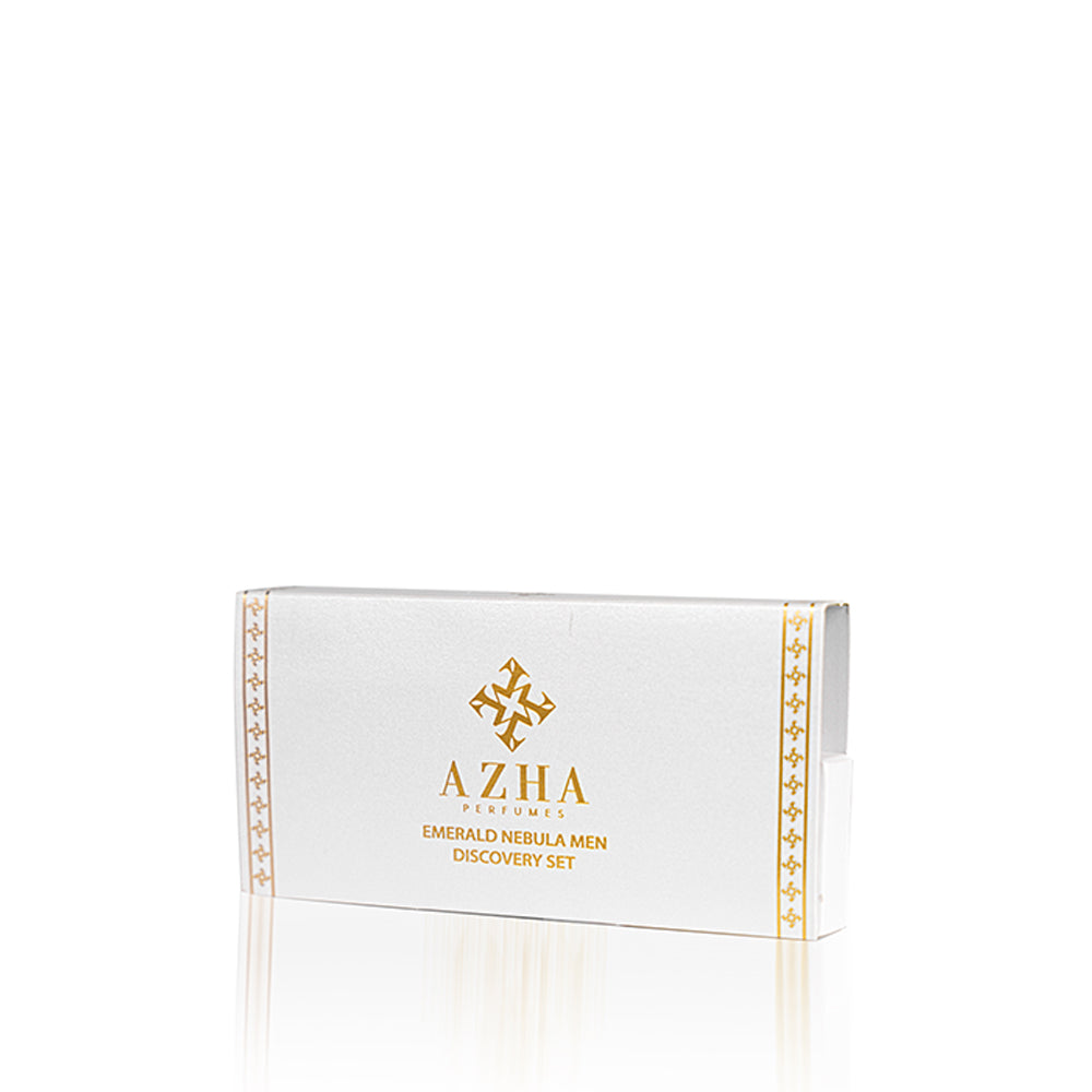 The perfect way to test the luxurious Emerald Nebulla Collection for men. This 4-piece discovery set includes 2ml of each fragrance: Al Oud Al Aswad, Amber Malaky, Lubab, and Taj Al Oud, offering a refined blend of oud, amber, and woody notes. An ideal introduction to the rich scents of Azha Perfumes.